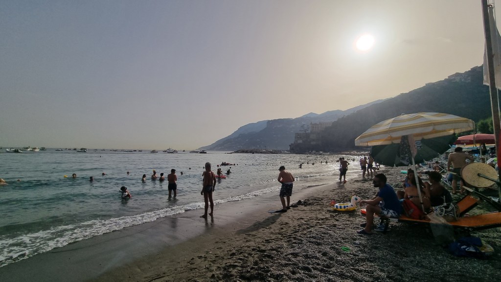 În Maiori am stat la plajă – ce bine a fost. Apă limpede, temperatură ideală, au fost 2 ore de relaxare totală. Și aici e interesant, am văzut niște lucruri frumoase, e mult mai puțin sofisticat, mai liniște și am mâncat foarte bine la un preț considerabil mai mic. Cu cât numele orășelelor este mai sonor, cu atât prețurile cresc.